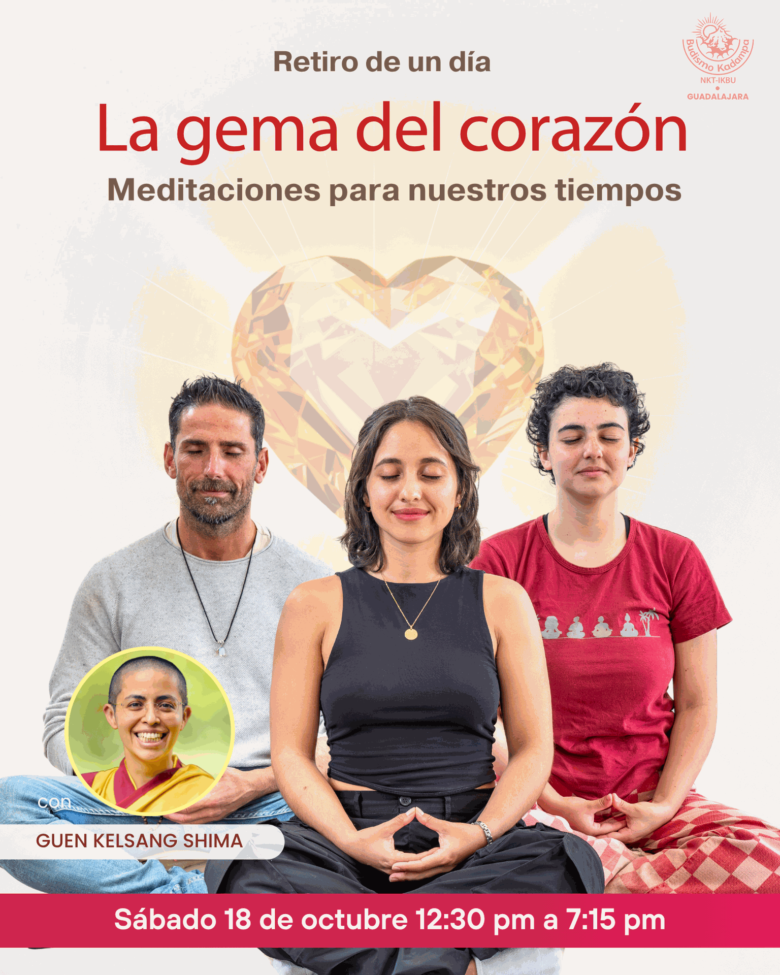 Gema del corazón es la práctica diaria de los kadampas sinceros, en ella encontramos un refugio y una fuente de inspiración diaria. Todos la podemos realizar y con ella establecemos una conexión cercana con el Buda de la Sabiduría tanto en su aspecto apacible como en el de un Buda protector.